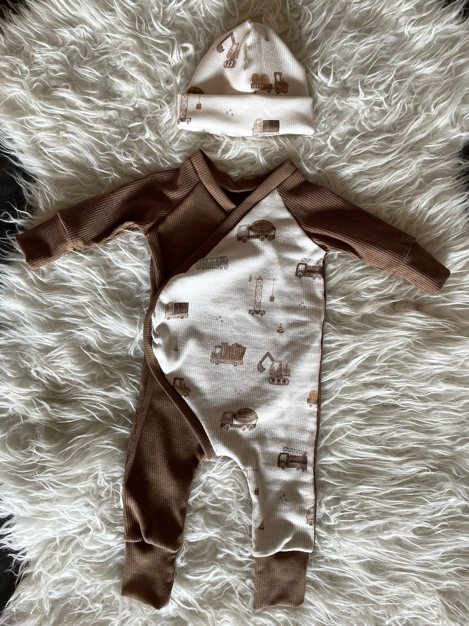 Baby Muts maat 50 gemaakt van zachte beige Rib Jersey met opdruk van bouwwvoertuigen.