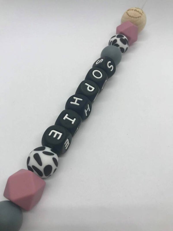 De letters kunnen veranderd worden in de naam van uw kindje. Mocht de naam meer letters hebben worden er kralen vervangen zodat de speenkoord wel aan de maximale lengte eisen voldoet. De letter kralen zijn verkrijgbaar in het zwart met witte letters (zie foto) en wit met zwarte letters.