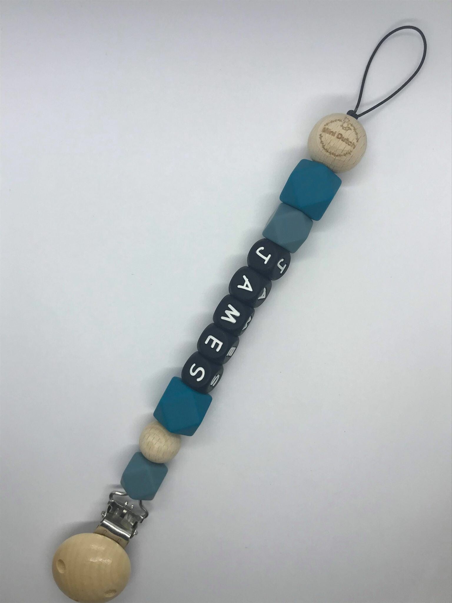 Speenkoord James is gemaakt van onbehandelde houten en gecertificeerde siliconen kralen. De letterkralen zijn aan te passen in de naam van uw kindje.
