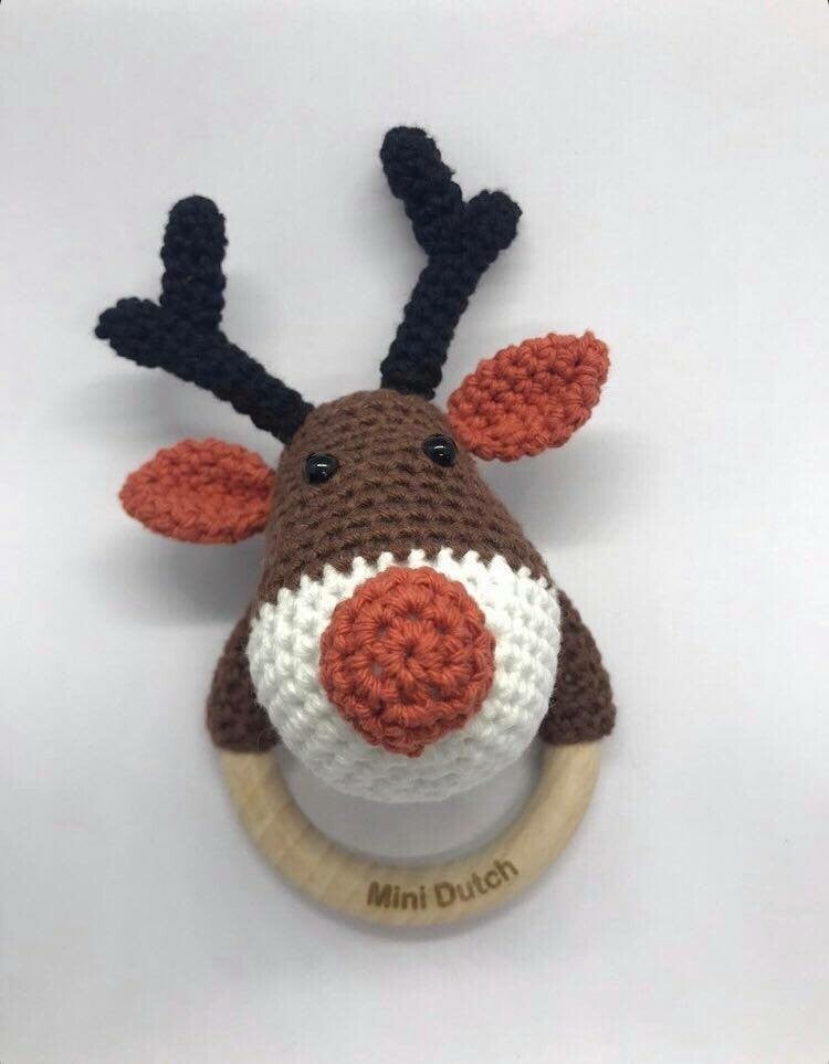 Mini Dutch rammelaar Rendier Rudlf is gemaakt van katoen. De houten ring is gemaakt van onbehandeld hout.