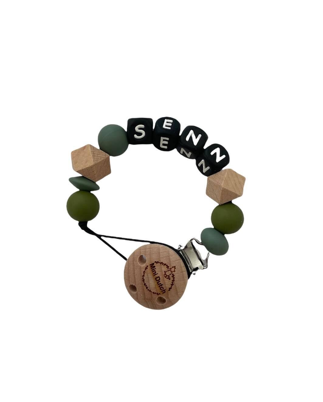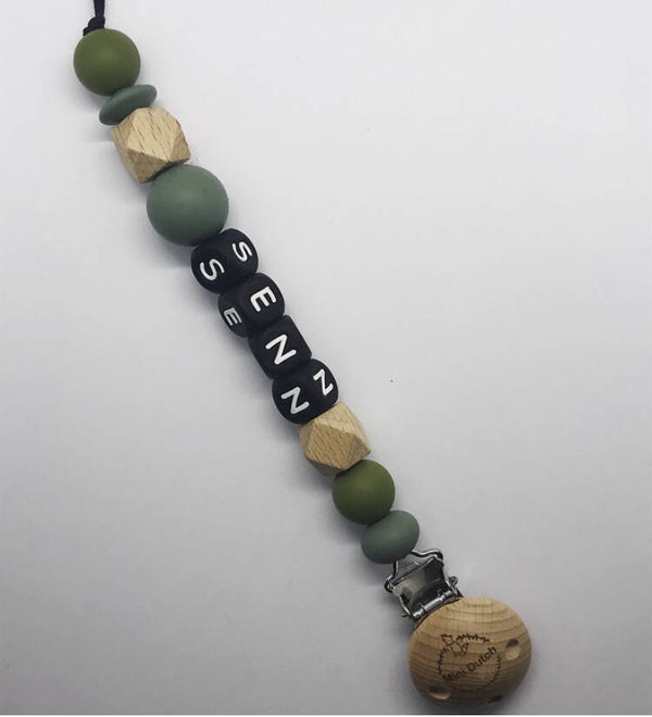 De kleuren die verwerkt zijn in het speenkoord zijn:camouflage, donker oud groen en houten kralen.