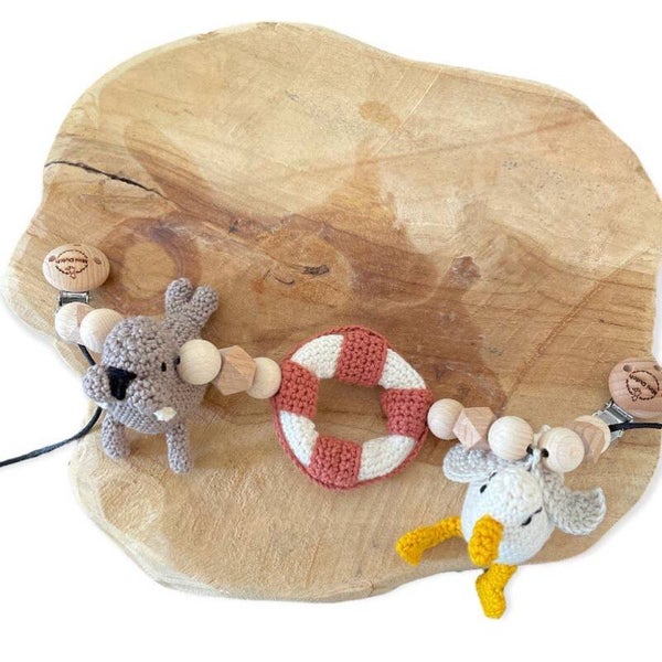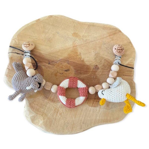 Wagenspanner Walrus, Zeemeeuw en boei is gemaakt van onbehandelde houten kralen en 100% katoen. De hangers bestaan uit een zeehond, ijsje en kwal de kleuren zijn grijs, bruin en blush roze.